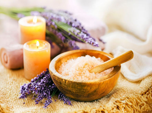 Premium Textil-Leinwand Lavendelsalz in Holzschale mit Kerzenlicht