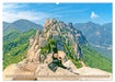 Februar: Junge Frau sitzt auf einem Felsgrat mit spektakulärem Blick über den Seoraksan Nationalpark, Südkorea