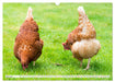 Juni: Haushühner (Gallus gallus domesticus) picken auf einer Wiese