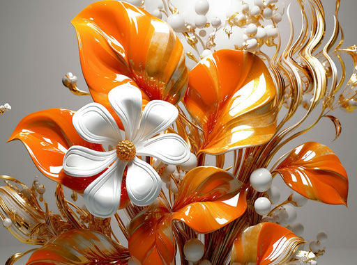 Elegante Blüten in orange, gold und weiß. In den zauberhaften, leuchtenden Sonnenfarben laden zum Betrachten ein. Ein zauberhaftes Arrangement von...