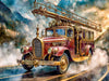 Das Feuerwehrauto präsentiert sich als Steampunk-Darstellung, das heißt, entstanden aus der Vorstellung, wie sich Menschen im Zeitalter der Dampfmaschine wohl damals zukünftige technische Entwicklungen vorgestellt haben könnten. Aus dieser Vorstellung ist mithilfe künstlicher Intelligenz dieses fantasieanregende Bild entstanden, das auf jeder Wand ein Hingucker ist.