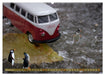 Januar: Gefrorene Gelassenheit: Ein Camping Bus schlittert vorsichtig auf dem Eis, während Pinguine ihn neugierig beobachten