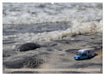 Juli: Küstenkurs: Ein Wohnmobil fährt entspannt am Strand entlang, wo Sand und Wellen sich vereinen
