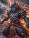 Susanoo erscheint als imposanter Krieger mit wildem, zerzaustem Haar, das wie ein tobender Sturm weht. Er trägt eine dunkle Samurai-Rüstung, geschmückt mit Wolkenmustern und Blitzen, während seine Augen vor Zorn und Entschlossenheit glühen. In seinen Händen hält er ein gewaltiges, von Blitzen umhülltes Schwert, und um ihn herum tobt ein gewaltiger Sturm mit peitschendem Regen.