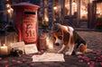 Mit gesenktem Kopf und gespitzten Ohren beugt sich der Detektivhund über verstreute Briefe auf dem Pflaster. Neben ihm flackern Kerzen im Wind, eine alte Kamera liegt bereit, als wäre jeder Moment entscheidend. Der rote Briefkasten wirkt verlassen, doch rundherum deuten Spuren, Rosenblätter und handgeschriebene Seiten auf eine Nachricht hin, die nie ankam. Der Hund trägt einen klassischen Detektivhut und scheint zu wissen, dass hier etwas Wichtiges verloren ging. Die Szene spielt in einer ruhigen Gasse bei Nacht, zwischen Laternenlicht und dem Gefühl, dass gleich etwas entdeckt wird. Das Bild wurde mit Hilfe künstlicher Intelligenz erstellt.