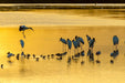 Der Waldstorch, Nordamerikas einziger heimischer Storch, besticht durch ein urzeitliches Aussehen - kahler Kopf und Hals, kräftiger Schnabel. Als ruhiger Schreitvogel watet er geduldig durchs seichte Wasser und findet dort seine Nahrung. Auf dem Foto versammeln sich Waldstörche und andere Vögel kurz vor Sonnenuntergang bei Ebbe, um dann gemeinsam zu ihren Schlafplätzen in den Bäumen zu fliegen.