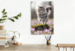 Premium Textil-Leinwand Eine Maine Coon Katze springt über einen Felsen und bewegt sich voller Energie durch die Frühlingsblumen