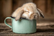 Ein flauschiges Häschen döst friedlich in einer Tasse – ein liebevolles Leinwandmotiv voller Ruhe, Niedlichkeit und ländlichem Charme, das Herzen zum Schmelzen bringt.