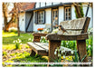 März: Ein Rotkehlchen auf der Bank, der Garten erwacht.