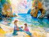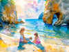 Aquarellbild mit Kindern am sonnigen Meeresstrand