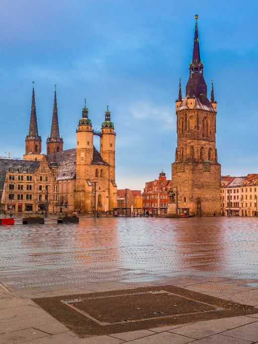 Morgendämmerung auf dem Marktplatz in Halle-Saale Halle-Saale, auch bekannt als Stadt der fünf Türme, ist geprägt von mehr als 1200 Jahren Geschic...