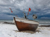 Am verschneiten Strand von Binz ruht ein kleines Fischerboot ruhig im frostigen Weiß. Die sanfte Schneedecke legt sich wie ein Schutzmantel über den hölzernen Rumpf, während hinter dem Boot das Meer still und grau unter dem winterlichen Himmel liegt.