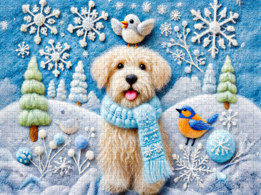 Filzhund im Schnee mit Vögeln Ein niedlicher Filzhund mit Schal genießt die verschneite Landschaft, umgeben von Vögeln und Schneeflocken. Perfekt ...