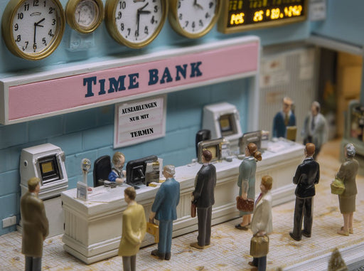 Humor im Büro – Wenn Sprüche zu Bildern werden Miniaturfiguren reihen sich geduldig vor dem Schalter der Zeitbank ein, wo jede höflich gestellte B...