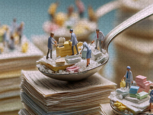 Humor im Büro – Wenn Sprüche zu Bildern werden Mitten in einem Aktenchaos balancieren Miniaturfiguren auf überdimensionalen Löffeln, die unermüdli...