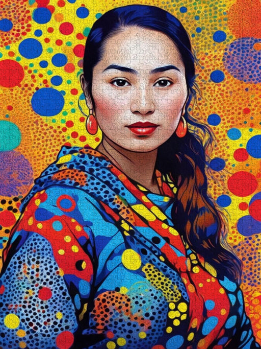 Neo-Pop, inspiriert vom Werk Yayoi Kusamas Dieses farbenfohe Porträt steht hier als Hommage an Yayoi Kusama, die "Queen of Polkadots", die alles m...