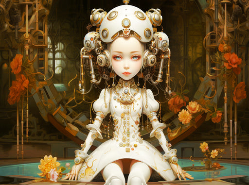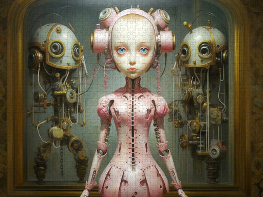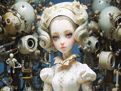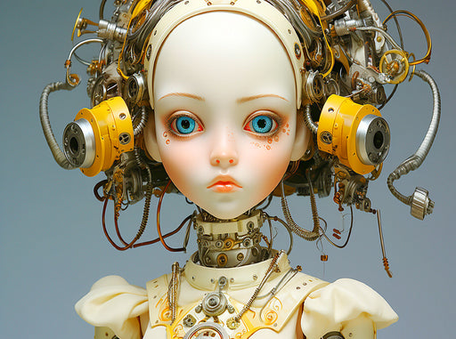 Roboterpuppe Diese Pop-surrealistische Roboterpuppe, die wie eine Porzellanpuppen aus einer fernen Zukunft wirkt, zeigt eine einzigartige Kombinat...