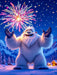 Ein Yeti steht auf einem verschneiten Berghang und blickt lächelnd in den Nachthimmel. Über ihm explodieren bunte Feuerwerksraketen, deren Licht sich in seinen Augen widerspiegelt. Hinter ihm liegt das leuchtende Yeti-Dorf.