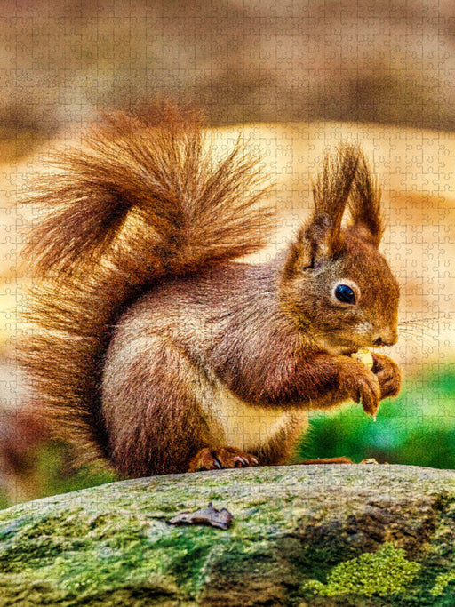 Vollständige Details anzeigenDie dunklen, glänzenden Augen des Eichhörnchens sind aufmerksam auf sein Futter gerichtet, während seine kleinen Ohren mit feinen Haarbüscheln spitz in die Luft ragen. - CALVENDO Foto-Puzzle'