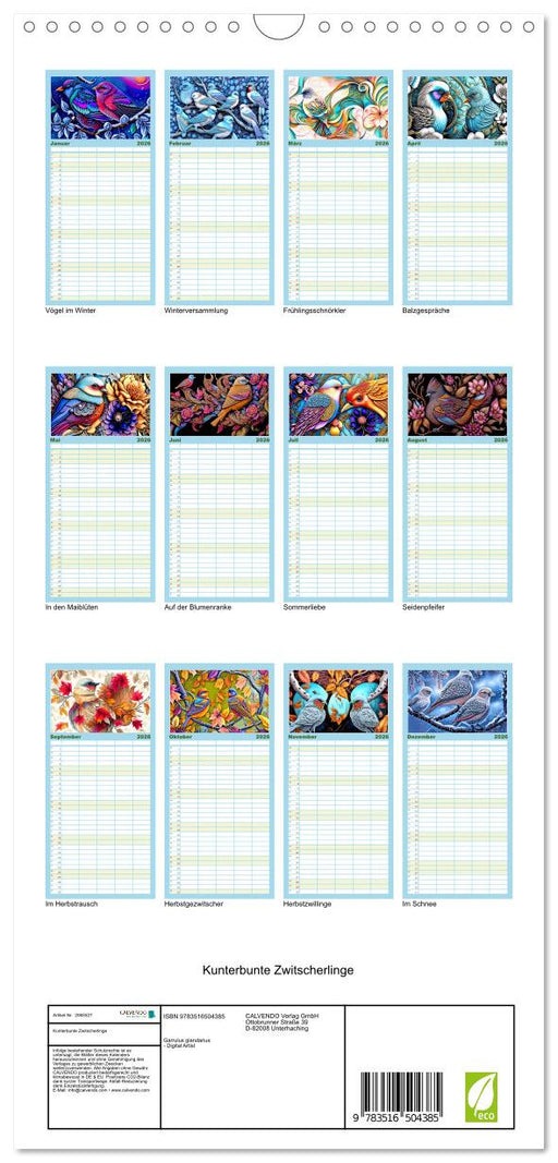 Vollständige Details anzeigenKunterbunte Zwitscherlinge (CALVENDO Familienplaner 2026)
