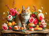 Elegante Katze inmitten eines opulenten Stilllebens klassische Kunst neu interpretiert