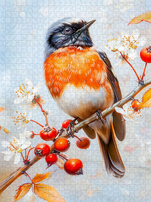 Detailgetreue Malerei eines Gartenrotschwanzes zwischen roten Beeren Diese kunstvolle Malerei zeigt einen Gartenrotschwanz auf einem Zweig mit leu...