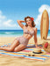 Betrachten Sie unsere bezaubernde Strand-Schönheit, die in einem stilvollen Bikini vor der Kulisse einer sonnigen Küste posiert. Jedes Detail dieser Illustration fängt die ikonische Ästhetik der 50er Jahre ein – von der klassischen Pose über den eleganten Schnitt des Bikinis bis hin zum verführerischen Augenzwinkern.