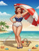 Betrachten Sie unsere bezaubernde Strand-Schönheit, die in einem stilvollen Bikini vor der Kulisse einer sonnigen Küste posiert. Jedes Detail dieser Illustration fängt die ikonische Ästhetik der 50er Jahre ein – von der klassischen Pose über den eleganten Schnitt des Bikinis bis hin zum verführerischen Augenzwinkern.