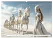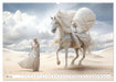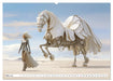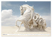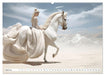 Dieser Kalender entführt uns in eine faszinierende Welt, in der Surrealismus und Pferde aufeinandertreffen. Die Szenerie ist in hellen beigen und weißen Farbtönen gehalten, die Himmel sind lichtvoll pastellblau.