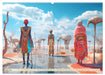 Inmitten dieser traumhaften Kulisse begegnen Ihnen faszinierende tierische Begleiter wie Leoparden, Schakale und Echsen, und versetzen Sie in eine andere Welt fernab vom Gewohnten. Auch die imaginären farbenfrohen Figuren mit ihren prächtigen Kleidern sind inspiriert von der Massai-Kultur. Ein absolutes Juwel für jeden Kunstliebhaber des Surrealismus.