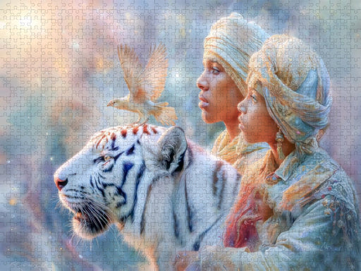 Elegante Frauen mit Elefant und Vögeln Erlebe ki-generierte Werke friedlicher, paradiesischer Szenen, in denen Mensch und Tier glücklich zusammenl...