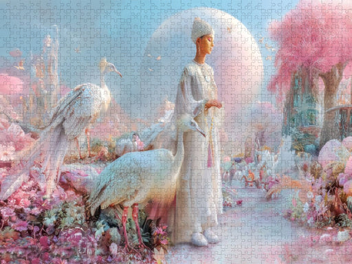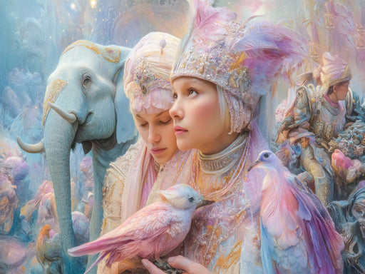 Märchenhafter Wolkenritt Tauche ein in sanfte Welten, in denen Mensch und Tier in Harmonie miteinander leben. Die Pastellfarben Rosa und Hellblau ...