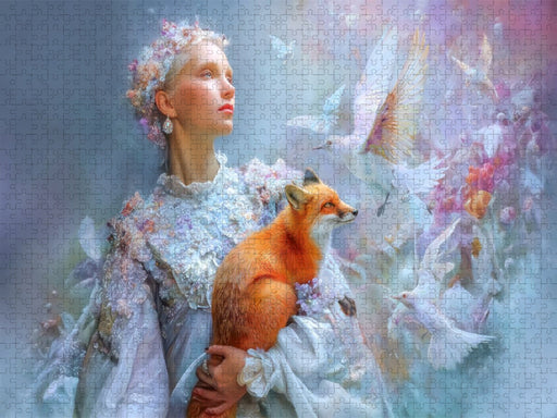 Eine Frau hält einen Fuchs im Arm Erlebe ki-generierte Werke friedlicher, paradiesischer Szenen, in denen Mensch und Tier glücklich zusammenleben....