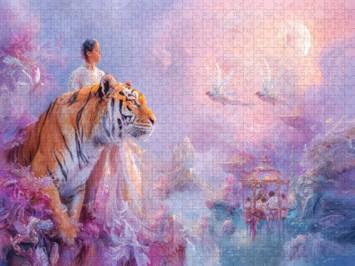 Herrliche Landschaft mit Frau und Tiger Erlebe ki-generierte Werke friedlicher, paradiesischer Szenen, in denen Mensch und Tier glücklich zusammen...