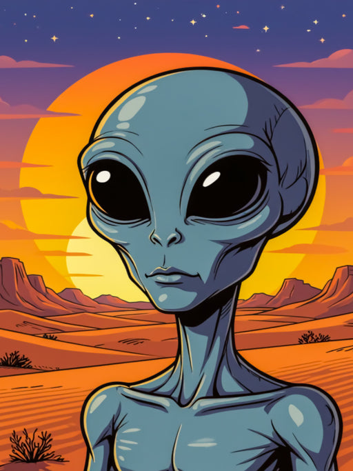 Wir sind nicht allein - UFO-Mythen Ein einzelner Grey steht in Nahaufnahme in einer kargen Landschaft. Seine großen schwarzen Augen wirken eindrin...