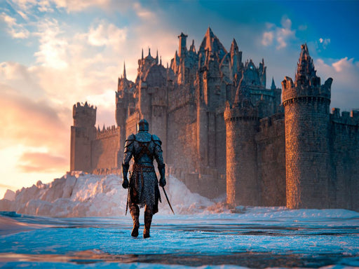 Legenden des Mittelalters Ein einsamer Ritter schreitet durch den Schnee auf eine gewaltige Festung zu. Die untergehende Sonne taucht Mauern und H...