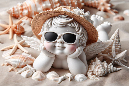 Niedliche Putte im Sommerurlaub Mit Strohhut, Sonnenbrille und einem Lächeln zum Verlieben liegt dieser kleine Engel entspannt im Sand – umgeben v...