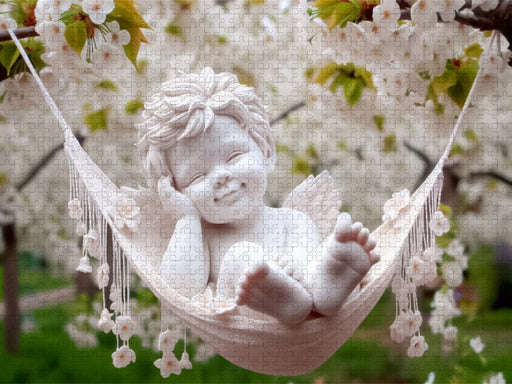 Wo Putten in Blüten träumen Ein kleiner Engel ruht in einer zart geschmückten Hängematte, umgeben von blühenden Kirschbäumen und dem Duft des Früh...