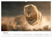Juni: Ein Löwe springt kraftvoll durch Staub und Sand