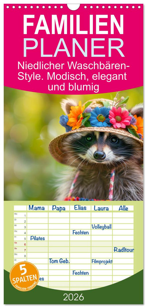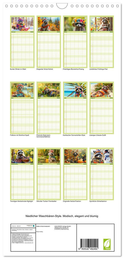 Vollständige Details anzeigenNiedlicher Waschbären-Style. Modisch, elegant und blumig (CALVENDO Familienplaner 2026)