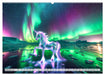 Februar: Einhorn unter dem Nordlicht: Ein schimmerndes Einhorn unter der Aurora Borealis in einer eisigen Landschaft.
