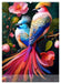 August: Zwei Paradiesvögel mit bunten leuchtenden Gefieder sitzen zwischen zarten Blumen