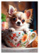 Juni: Ein blauer Kaffeebecher und Hortensien schmücken diesen kleinen frechen Chihuahua