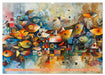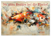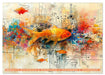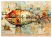 Die Bilder zeigen ein lebendiges und abstraktes Kunstwerk. Der Hintergrund ist reich an technischen Schemata, überlagert mit Farbspritzern und verschiedenen Texturen, die dem Werk Tiefe und Komplexität verleihen. Der Fisch selbst ist stilisiert mit Mustern und Formen, die sich nahtlos in den detaillierten Hintergrund einfügen. Dieses Kunstwerk könnte für seine einzigartige Verschmelzung von organischen Lebensformen mit mechanischen Designelementen interessant sein, was eine Harmonie zwischen Natur und Technologie suggeriert.