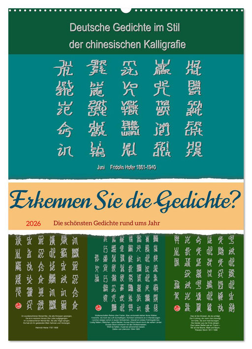Ausgewählte deutsche Gedichte für jeden Kalendermonat rund ums Jahr werden im Stil der chinesischen Kalligrafie geschrieben. (Monatskalender, 14 S...