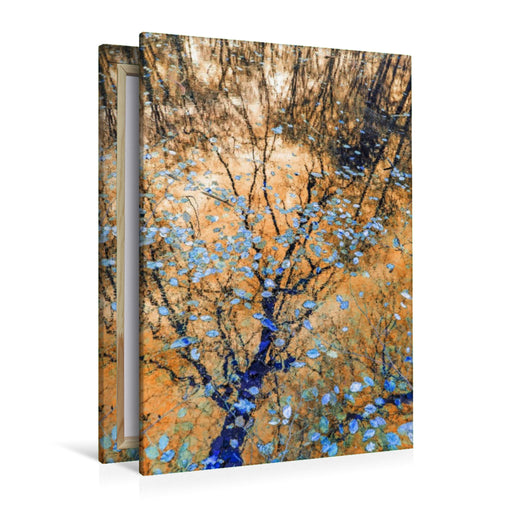 Spiegelung der Natur Bäume mit üppigem Laub spiegeln sich sanft im stillen Wasser, während leuchtende Farbtöne in Blau und Orange eine friedvolle,...
