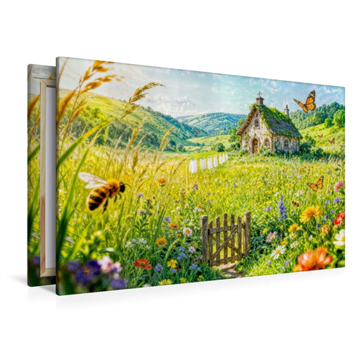 Vollständige Details anzeigenPremium Textil-Leinwand Sommer‑Cottage auf Blumenwiese mit Wäscheleine