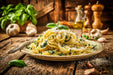 Premium Textil-Leinwand Italienische Pasta, Genuss auf rustikalem Teller