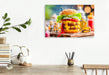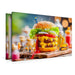 Premium Textil-Leinwand Miniatur Bauarbeiter mit Bagger servieren saftigen Burger am Grill