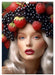January: Portrait einer brünetten Frau mit einer Hutkreation aus Erdbeeren